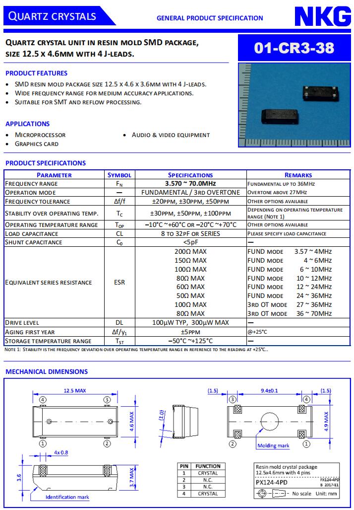NKG晶振|01-CR3-38晶振|01-CR3-38-16M384-T20-3050M贴片晶体,NKG晶振,01-CR3-38进口贴片晶振,无源晶振,01-CR3-38-16M384-T20-3050M晶振,陶瓷谐振器,石英晶振,SMD晶体,12.5×4.6×3.6mm晶振,四脚封装晶振,频率16.384MHz,负载20pF,频率容差30ppm,工作温度范围-40~85°C,低成本晶振,高稳定性晶振,高品质晶振,数码产品晶振,网络附属存储晶振,家庭自动化晶振,多媒体设备晶振.