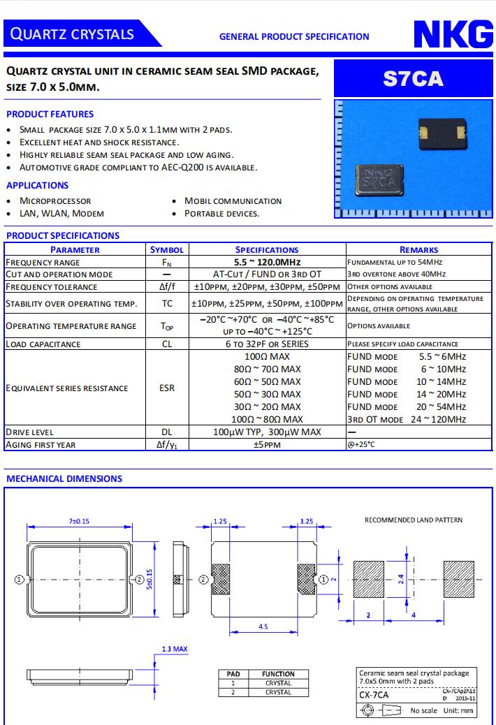 NKG Crystal|S7CA晶振|S7CA54.0000F16M1Y-EXT|6G网络终端晶振,NKG Crystal,S7CA进口晶振,无源晶振,S7CA54.0000F16M1Y-EXT晶振,石英晶体谐振器,SMD晶体,7050贴片晶振,二脚封装晶振,频率54MHz,负载16pF,频率容差10ppm,工作温度范围-40~85°C,高精度晶振,高可靠性晶振,无铅环保晶振,6G网络终端晶振,笔记本电脑晶振,数字设备晶振,测试与测量设备晶振.