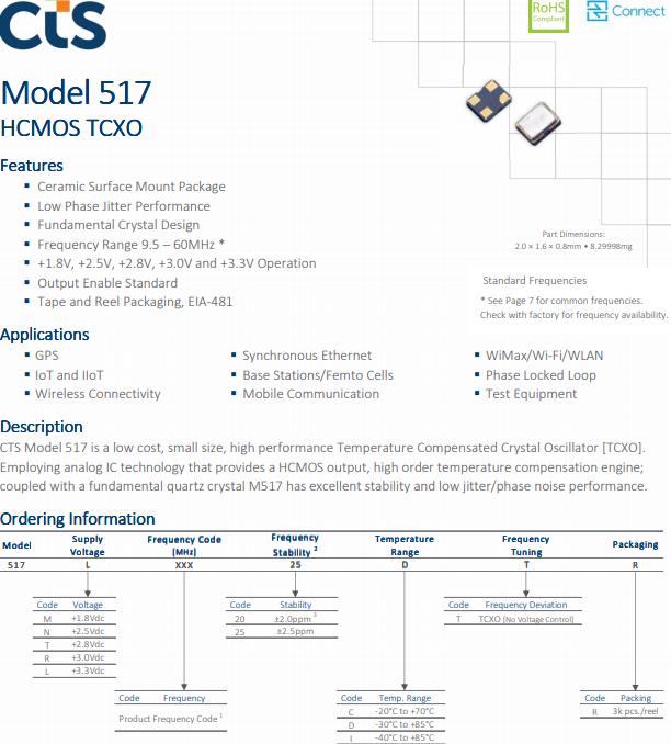 CTS Model 517 is a low cost, small size, high performance Temperature Compensated Crystal Oscillator [TCXO].