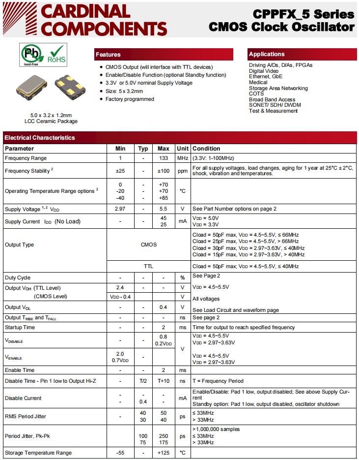Cardinal晶振CPPFX_5系列石英贴片晶振,现场可编程晶体振荡器,CMOS输出(将与TTL设备接口)启用/禁用功能(可选备用功能)3.3V或5.0V标称电源电压,小体积晶振尺寸5.0x3.2mm工厂编程,有源晶振,四脚贴片晶振,石英晶体振荡器,石英晶振,具有超小型,轻薄型,耐热及耐环境特点。应用于:驱动A/D,D/As,FPGAs,数字视频,以太网,GbE,医疗设备,存储区域网络,COTS,宽带接入,超声波/SDH/DWDM,测试和测量。CMOS输出时钟振荡器CPPFXC5LZ-A7BR-50.0TS适用于医疗设备