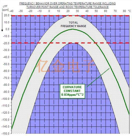 绿色曲线显示了曲率常数k=0.034ppm/C的理想压电晶体,其转折点正好在+25°C,并且在室温(0ppm)下被设置为中心频率.